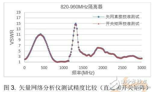 经过校准后,开关矩阵和测试电缆成为了矢量网络分析仪的一部分,成都修明环保科技有限公司针对铁氧体隔离器作为被测件进行了比较测试,结果如图3所示。